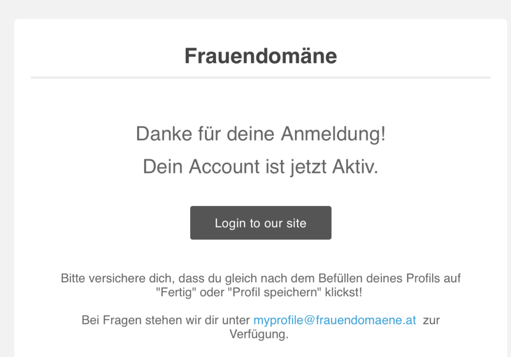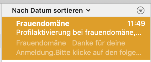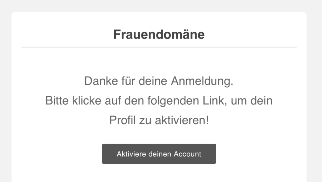 Nach der Registrierung bekommst du zwei E-Mails von uns "Profilaktivierung" & "Willkommen bei der Frauendomäne".