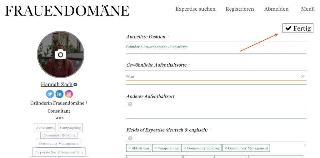 Befülle dein Profil und klicke oben auf "Fertig" oder scrolle ganz nach unten und klicke auf "Profil speichern", um deine Änderungen zu speichern. Alle verpflichtenden Felder sind mit einem * gekennzeichnet, auch dein Foto ist eine Voraussetzung.